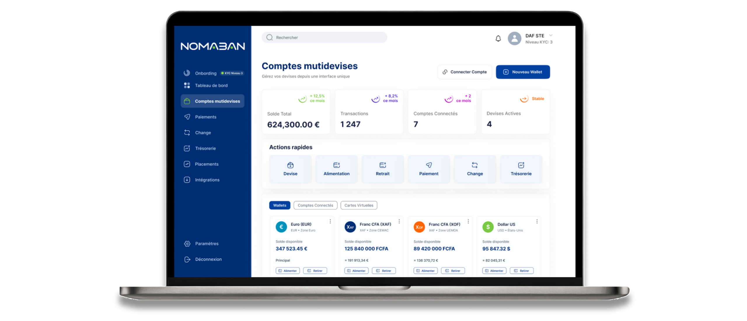 Nomaban prend en charge les principales devises internationales cotées (EUR, USD, etc.) ainsi que le et le dans un premier temps. La couverture sera étendue progressivement à d’autres devises africaines, conformément aux réglementations de change en vigueur.